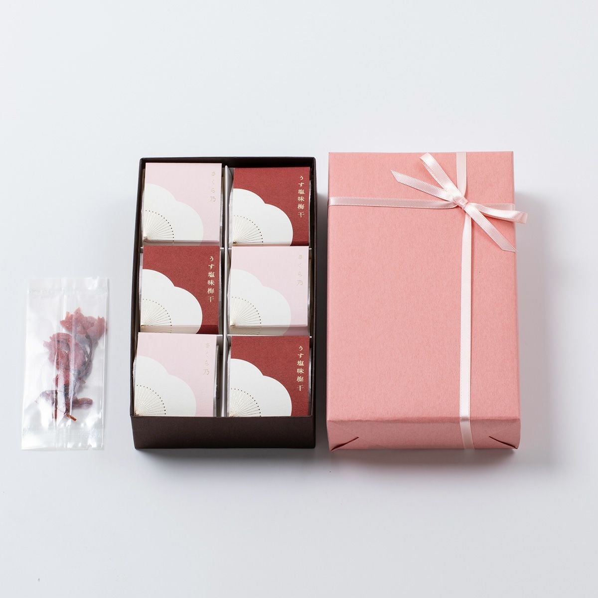 春の集いの手土産にぴったりなさくら乃とうす塩味梅干の個包装6粒入りギフトセットです。 さくら乃は春限定の優しい味わいの梅干、うす塩味梅干しは当店一番人気の減塩仕上げの梅干しです。