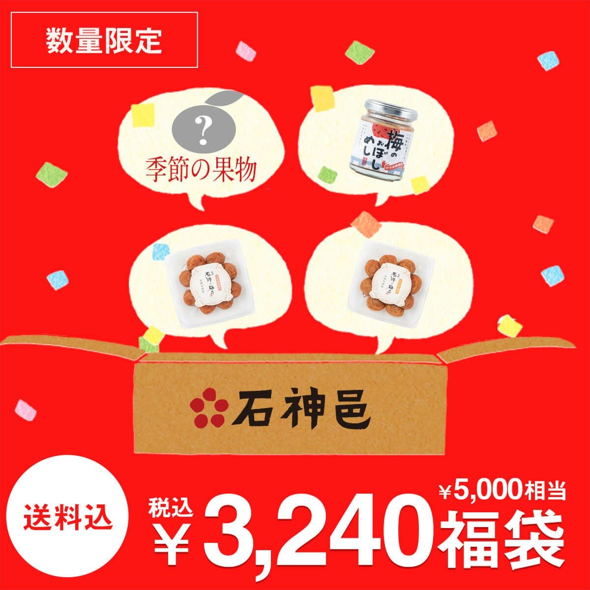 石神邑の梅干や梅加工品、県産の果物などを詰め込んだお得なセットです。