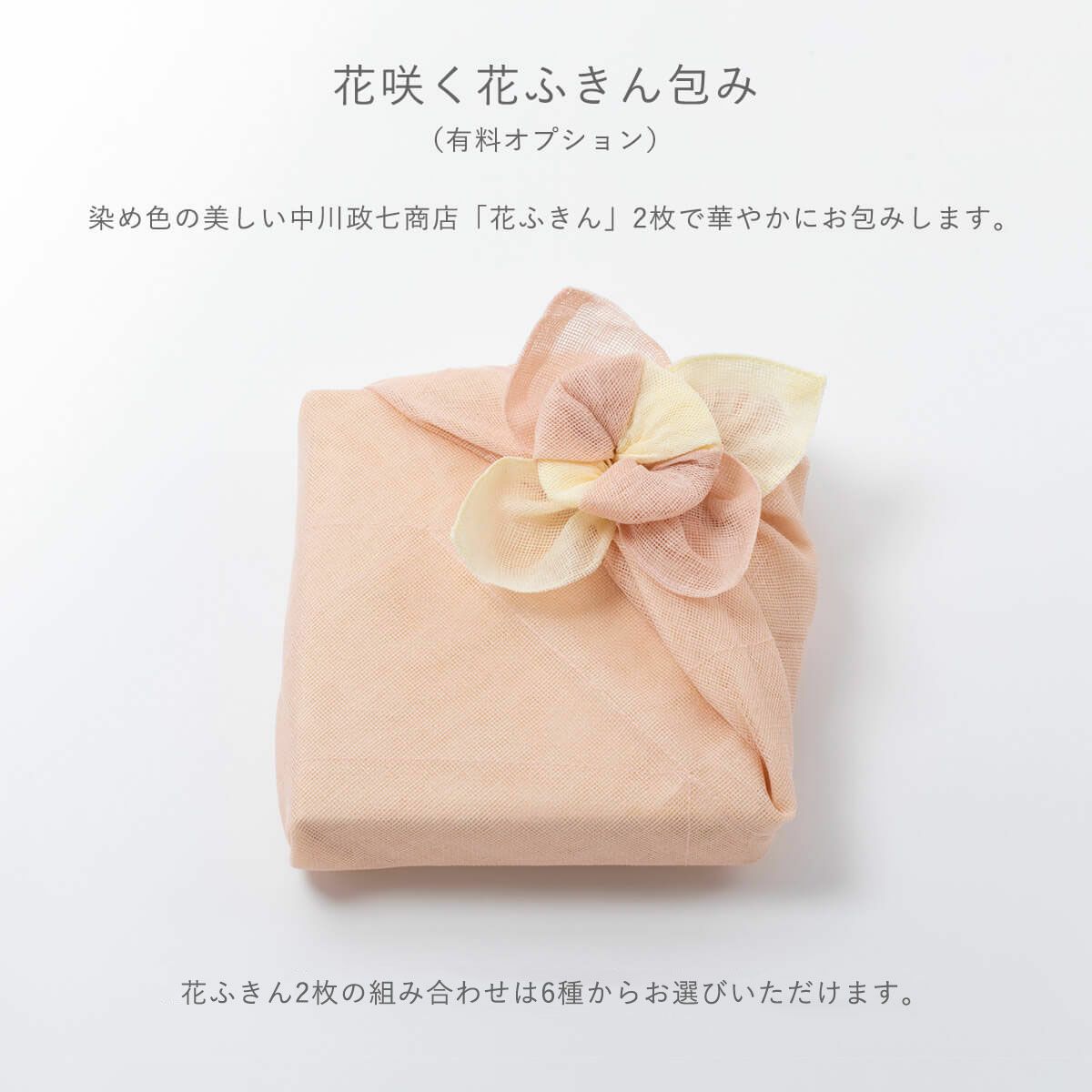 お届けします。梅干木箱を中川政七商店「花ふきん」でお包みします。花ふきん1枚を使用した「花ふきん包み」2枚を使った華やかな「花咲く花ふきん包み(有料オプション)」がございます。