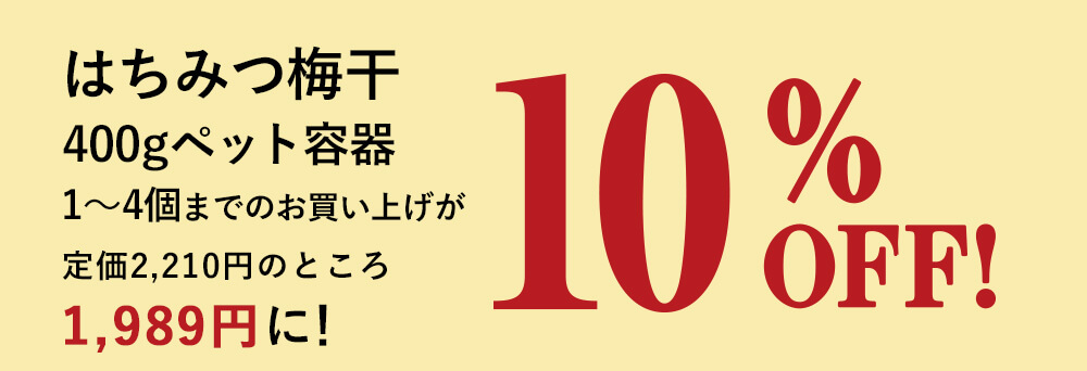 石神邑人気の「はちみつ梅干」ペット容器400gと、まろやかな酸味とほのかな甘さがとけあう味わい「うす塩味梅干」ット容器400gを、お得な割引価格でご用意しました。組み合わせは自由ですのでお好きな梅干をご希望の個数で組み合わせて、この機会にぜひお買い求めください。 「うす塩味梅干」ペット容器400gはこちら